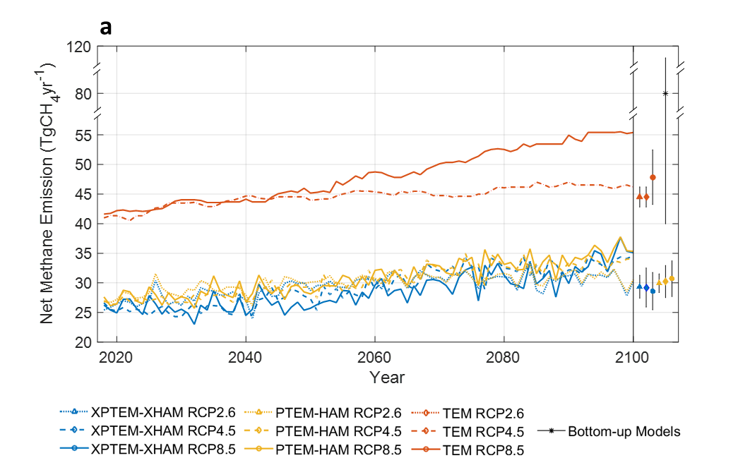 研究人員將最近在北極礦物土壤中發(fā)現(xiàn)的高親和力甲烷氧化菌(HAMs;甲烷氧化細(xì)菌)和產(chǎn)甲烷菌的動(dòng)力學(xué)整合到包含永凍層土壤有機(jī)碳動(dòng)力學(xué)的生物地球化學(xué)模型中。新模型預(yù)測(cè),由于永凍層中的有機(jī)碳在較暖和的氣候下會(huì)更容易被微生物降解,在2017年至2100年之間濕地甲烷排放量將增加一倍。但是,高地凍土由HAMs主導(dǎo)的甲烷匯強(qiáng)度同時(shí)也在增加,因而抵消了大部分濕地甲烷的排放,令北極地區(qū)甲烷凈排放量?jī)H增加18%。預(yù)計(jì)由于HAMs和產(chǎn)甲烷菌對(duì)溫度上升所作出的生理反應(yīng)有異,北極地區(qū)甲烷凈排放量可能會(huì)進(jìn)一步降低。