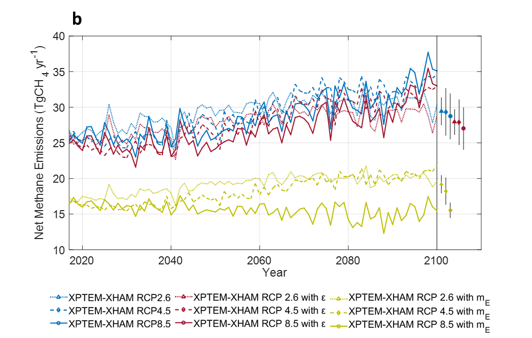 從2017年到2100年北極(北緯50°以上)年度凈甲烷排放量預(yù)測(cè)